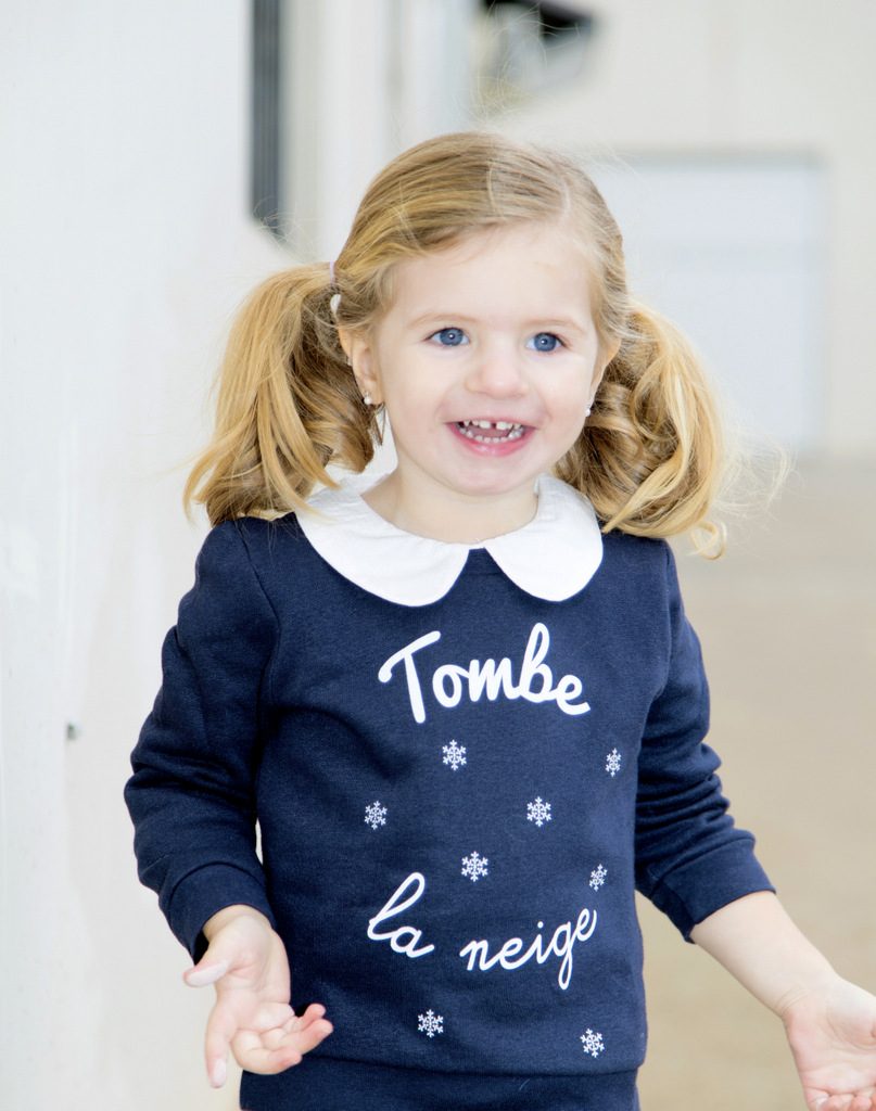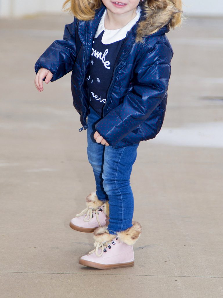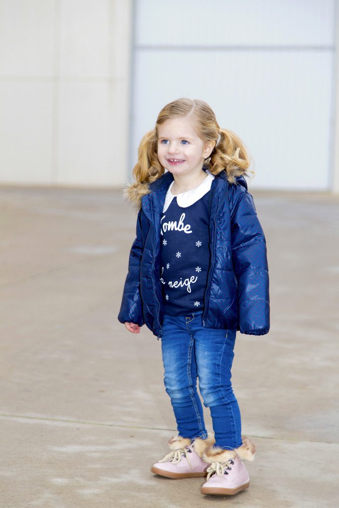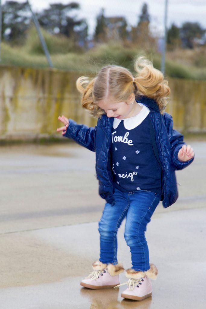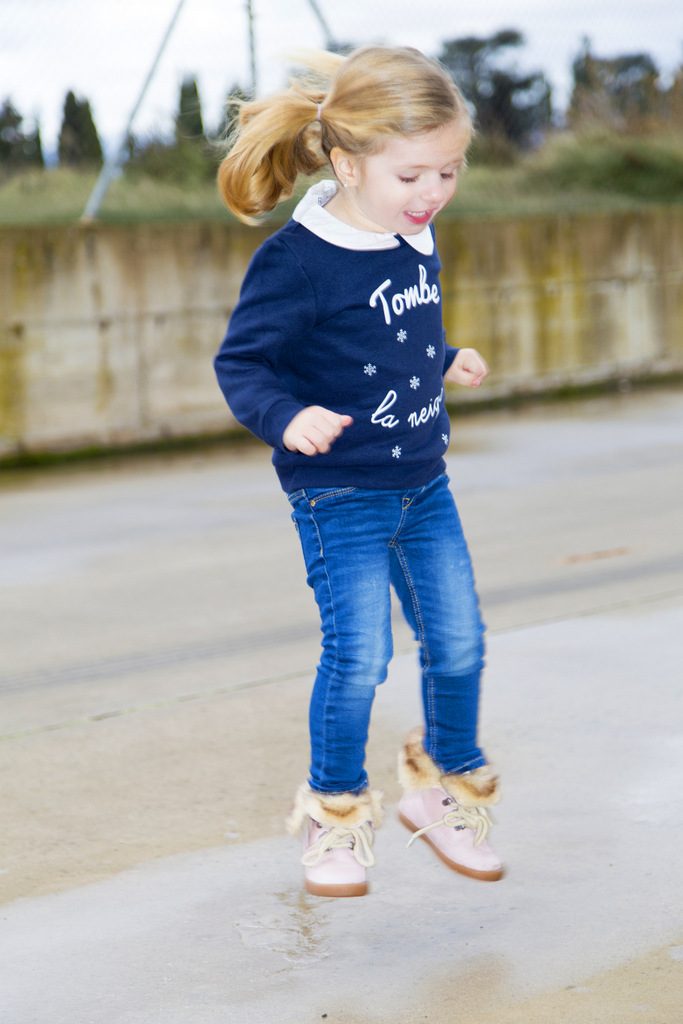 Que mayor la veo vestida así, pero os confieso que también me encanta… El plumas es super cómodo y calentito, igual que las botas. Necesitaba algo así porque en un par de semanas nos vamos a pasar unos días a Panticosa (si puedo quisiera ponerle sus primeros esquís), y no veía yo a la niña con merceditas andando por la nieve. El jersey, me encanta el texto «cae la nieve»