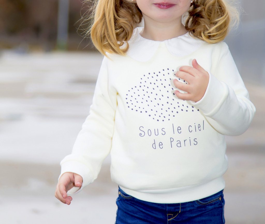 SOBRE EL CIELO DE PARÍS, otro texto precioso el de este jersey cuando lo vi y vi que tenían una boina azul marino compre ambas cosas pensando en look completo, pero la boina la pedí en la talla mas pequeña y no le cabe, una lastima…