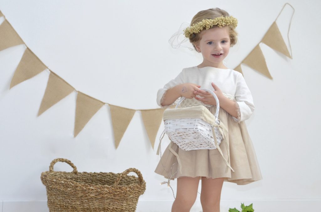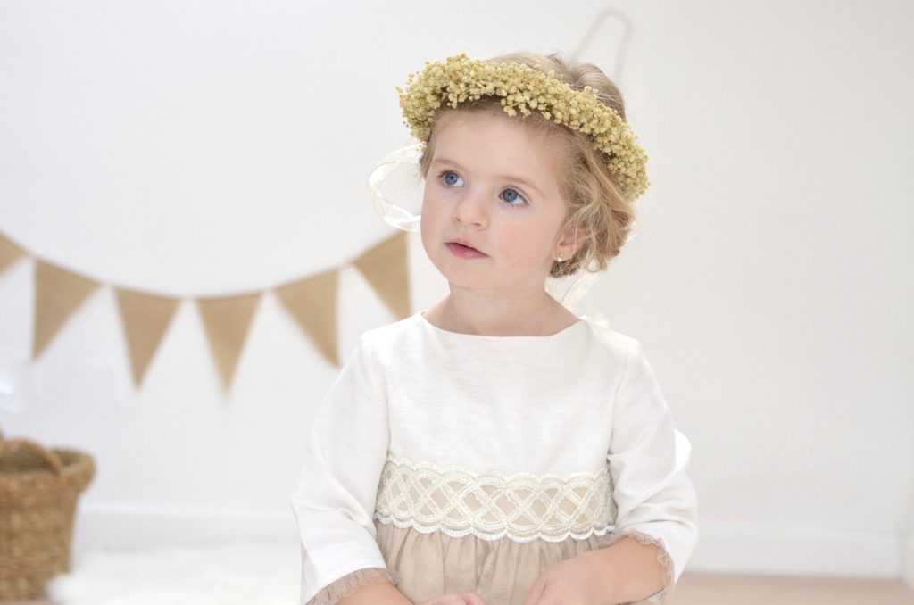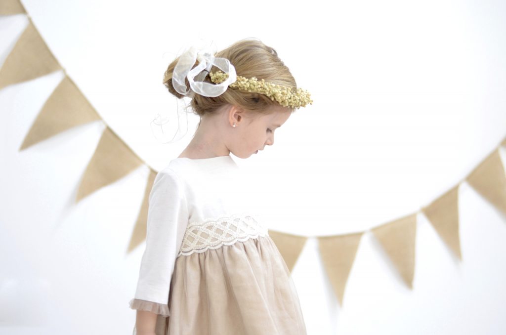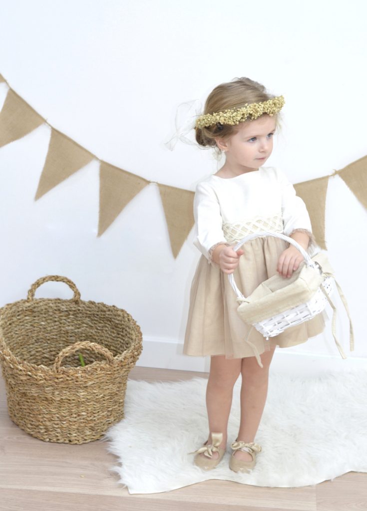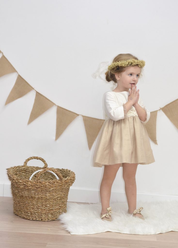 Bueno al grano, que este vestido para mi es espectacular, en tonos crudo y avellana confeccionado con lino y tul, lleva una especie de fajín cosido (mucho mas cómodo) con un toque de pedrería, y esa maga francesa rematada con tul tan acertada.