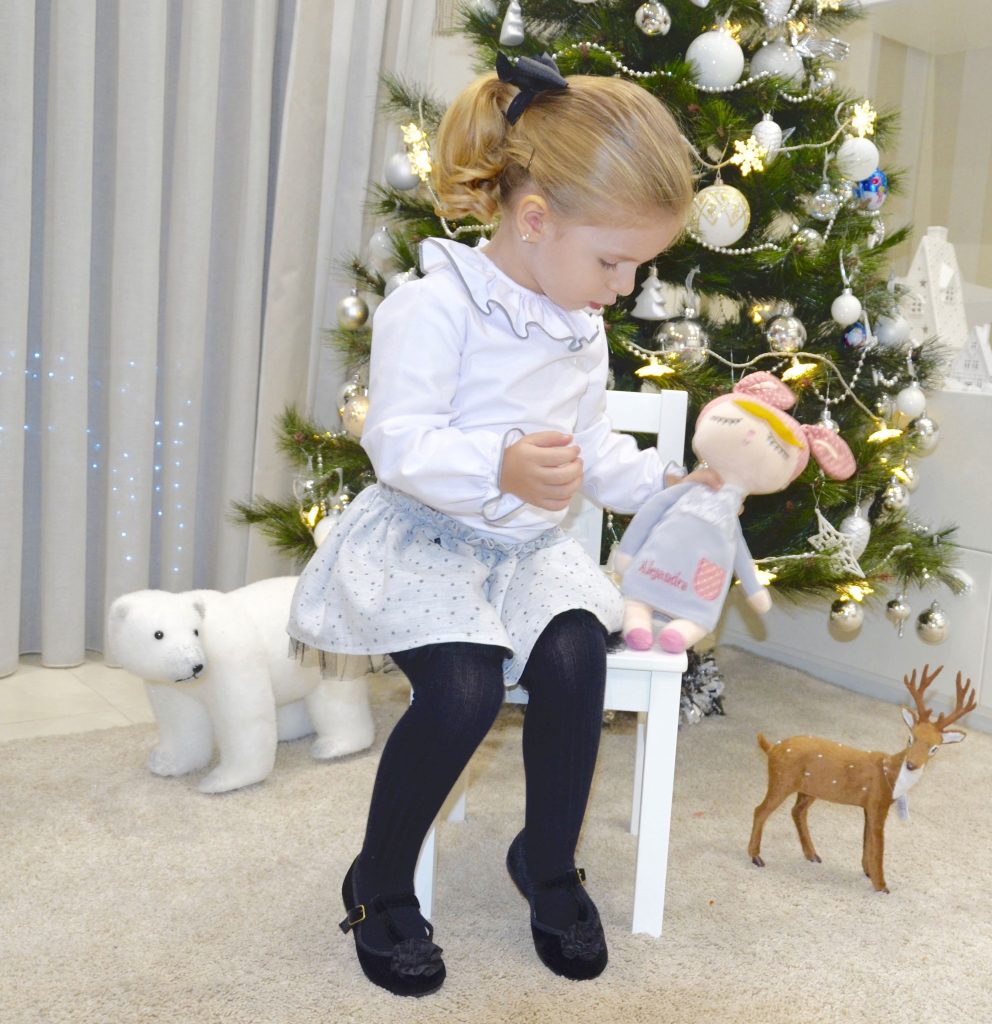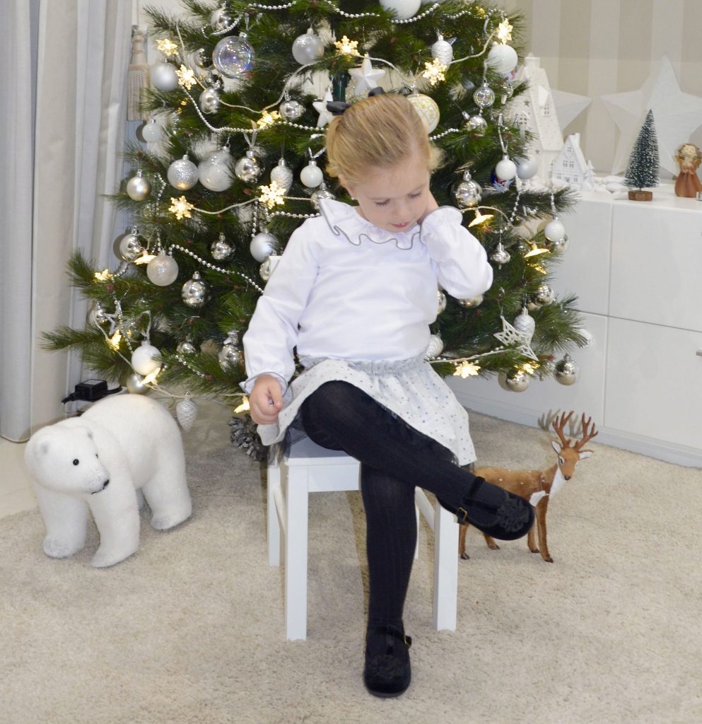 El look de hoy esta compuesto por camisa cuello volante con un pequeño pespunte gris, falda de estrellas gris con tul negro por debajo y merceditas de pulsera negras.